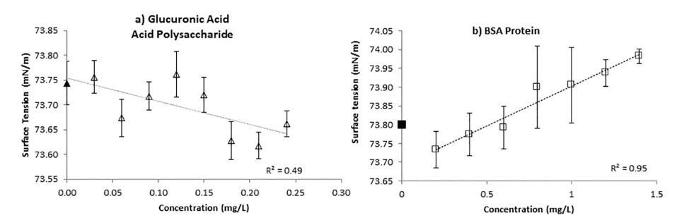 圖 5.a) 葡糖醛酸,一種酸性多糖,證明在低濃度下 SFT 降低。 b) 相反,BSA 蛋白在低 專注。 然而,BSA 在較高濃度下再次降低。 低濃度下 SFT 的這種增加可以通過水中 pH 值的降低來解釋 由 BSA 引起,圖 6。