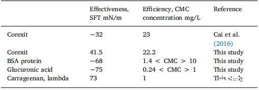 表 2 SFT 和 CMC 比較模型蛋白質和酸性多糖。 雖然Corexit 更有效地降低 SFT,EPS 模型成分更有效 因為需要低得多的濃度才能開始乳化(蛋白質)和 穩定成分(酸性多糖;結合大分子并添加 粘度)。