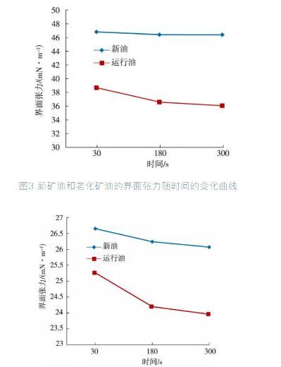 圖3新礦油和老化礦油的界面張力隨時間的變化曲線