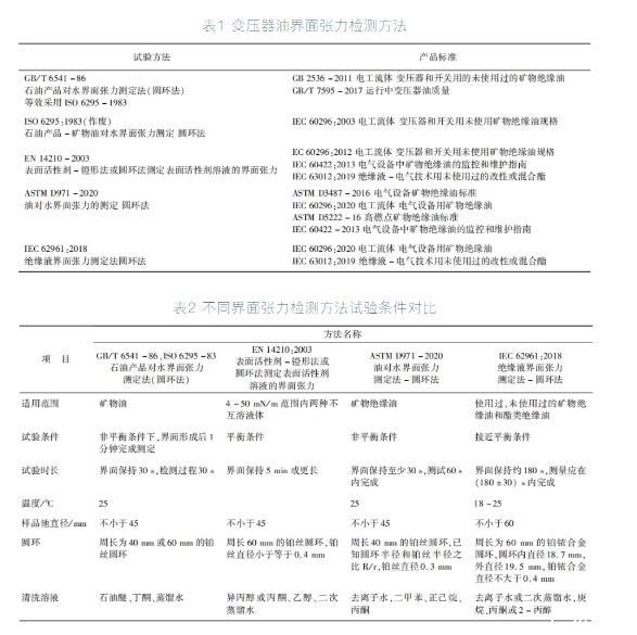 方法:不同產品標準所采用的界面張力檢測方法不同,具體如表1和2所示。可以看出,各方法的測量原理相同,測定絕緣油的界面張力的方法大都采用的是圓環法,主要區別就是界面形成后即非平衡條件、接近平衡條件及平衡條件下測試的保持時間不同。