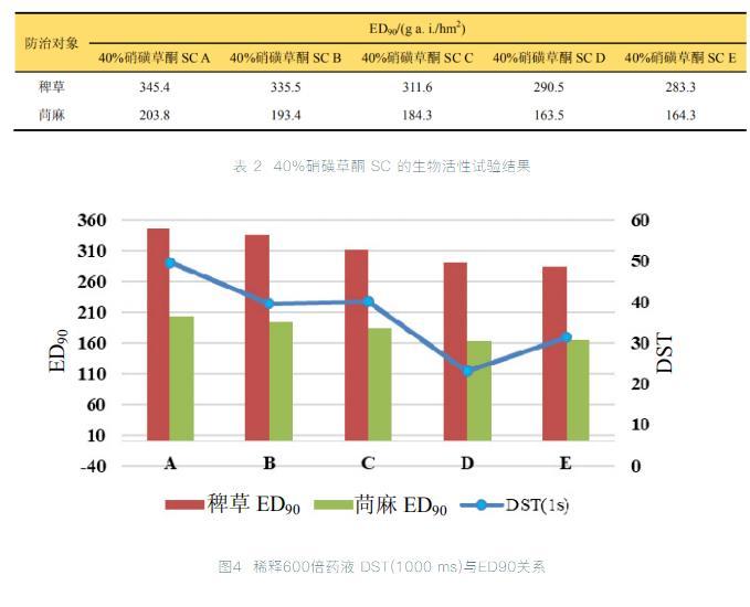 通過對480 g/L硝磺草酮懸浮體系制劑的研究,進而測定5個不同制劑配方的3種稀釋濃度液的動態表面張力,研究防治效果與動態表面張力的關系。結果顯示無論對禾本科還是闊葉雜草,懸浮體系藥液的動態表面張力的變化趨勢,在一定程度上與其藥效正相關。