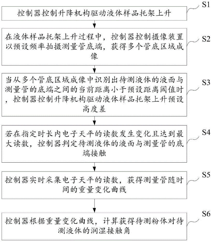 粉體材料潤(rùn)濕接觸角測(cè)量方法應(yīng)用于表面張力儀,所述表面張力儀包括殼體以及設(shè)置于殼體內(nèi)的電子天平、底端用微孔板封閉的測(cè)量管、液體樣品托架、升降機(jī)構(gòu)和攝像裝置;所述電子天平的底部設(shè)置有連接桿,所述連接桿與所述電子天平的稱(chēng)重盤(pán)固定連接,所述測(cè)量管垂直懸掛于所述連接桿下方,所述測(cè)量管的底端位于所述攝像裝置的攝影取景范圍中,所述測(cè)量管內(nèi)裝有待測(cè)粉體,所述液體樣品托架用于固定裝盛有待測(cè)液體的樣品容器,所述液體樣品托架由所述升降機(jī)構(gòu)驅(qū)動(dòng)升降;所述測(cè)量方法包括: