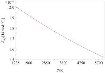 通過式(9)計算了液態Ag的表面過剩熵SAg(T),結果如圖4所示。根據文獻[36],理論上處于更高無序程度(熵)的物質狀態在較高溫度下更為穩定,因此,液體表面結構在較高溫度下可能會出現有序-無序轉變。然而,觀察圖4可知,在臨界溫度(6612 K)以下,SAg(T)隨溫度升高逐漸減小,這表明液態Ag表面總是保持有序結構。與此同時,液態Ag表面原子堆積比率與Ag(111)晶面相同的假設也得到了支持。此外,根據式(9)可知,SAg(T)∝a1/T2+a2/T,a1和a2為系數。這與前人研究結果略有不同,文獻[37]基于Skapski模型推導得到SAg(T)∝a2/T,而文獻[38]則根據楊氏方程推出SAg(T)∝a1/T2。