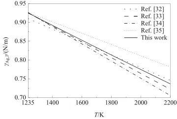 根據式(7),計算了液態Ag的表面張力γAg,T,結果如圖3所示。總體上,隨著溫度的升高,γAg,T呈現近似線性下降的趨勢。從圖中可以看出,γAg,T的預測值與文獻[32-34]具有較好的一致性,但略低于文獻[35]。
