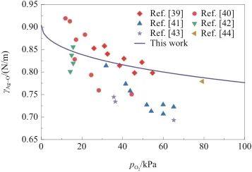 根據式(33),計算了1350 K下液態Ag-O系的表面張力γAg-O,并將計算結果與文獻數據[39-44]進行比較,如圖5所示。觀察圖5可知,γAg-O與氧氣壓力呈負相關。在較低的氧氣壓力下,γAg-O的下降幅度比較顯著;而隨著氧氣壓力增加,γAg-O的下降幅度逐漸減小。另外,計算結果與文獻[39,40,44]吻合良好,但高于文獻[41-43]。這種差異是可以接受的,因為所采用模型僅考慮了溫度和氧氣壓力,而在實驗過程中,系統的表面張力不可避免地受到雜質的影響。