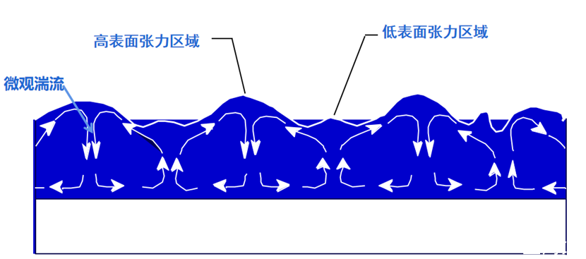 在液相涂層,在漆膜干燥過程中存在著微觀湍流。先干區(qū)域往往更多表現(xiàn)為樹脂本身的表面張力,液相部分還是保持有機硅或者氟添加劑的表面張力。低表面張力的液態(tài)部分會有強烈的向高表面張力的區(qū)域遷移的傾向,這樣的效果累積起來就會容易出現(xiàn)橘皮或者波浪紋!