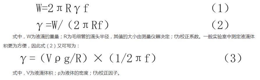 滴體積法的基本原理是這樣的,利用毛細管滴頭,緩慢往下滴液體,這時候測量液滴的大小,就能測定液體的表面張力。這是因為液體的表面張力,與從毛細管滴下的液滴的大小有內(nèi)在關聯(lián),存在正比關系,這個關系可以用數(shù)學公式表達: