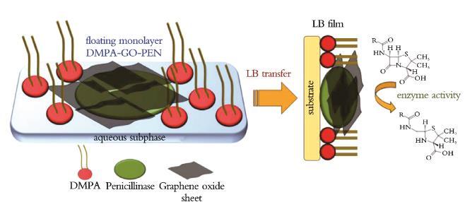 此外,將經(jīng)典兩親分子的Langmuir單層與酶結(jié)合是保持生物大分子催化性能的一種方式。F.A.SCHLL等研究了磷脂LB膜固定化青霉素酶(PEN),將GO加入青霉素酶‐脂質(zhì)Langmuir單層膜中,并作為LB膜轉(zhuǎn)移到固體載體上,評估了酶的催化性能(見圖3)。結(jié)果表明,GO作為由2,2‐二羥甲基丙酸(DMPA)和PEN組成的LB膜的添加劑,被固定在LB膜的PEN中;GO存在于酶脂LB膜中,不僅可以調(diào)節(jié)青霉素酶的催化活性,而且有助于數(shù)周后仍保持其酶活性。研究結(jié)果加強了混合納米結(jié)構(gòu)薄膜的重要性,證明了使用由脂質(zhì)、GO和酶組成的LB膜應(yīng)用于光學(xué)生物傳感器的可行性,對應(yīng)用傳感器的生物電子設(shè)備研究具有重要意義。