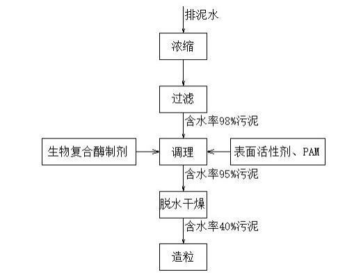 經純水稀釋后以0.008%比例和用自來水配置的濃度為0.1%的陰離子聚丙烯酰胺(分子量為800-1000萬)溶液加入到步驟S2中的混合料2中,以60r/min速度均勻攪拌,調理15min后得到含水率為95%的混合料3;