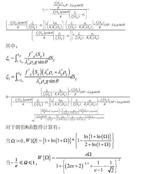 將速度場(chǎng)方程與氣體分流率方程結(jié)合,在遵循氣體質(zhì)量守恒的基礎(chǔ)上,從CO2入口端到混相帶前緣對(duì)含氣飽和度進(jìn)行積分,并用朗伯W函數(shù)求解得出混相前緣的位置,其表達(dá)式如下: