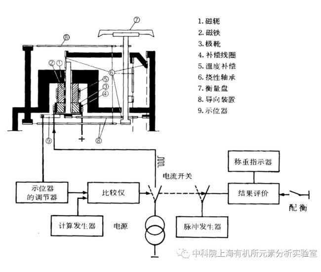 電子天平的結構原理如上圖所示。包括衡量盤在內的載荷接收裝置由兩對三角形導向裝置控制,衡量盤只能進行垂直運動。磁鐵裝置由永久磁鐵組成,磁軛和極靴連接在載荷接收裝置的最下端,補償線圈放在磁鐵裝置的空氣間隙中。如果電流流往線圈,線圈中就產生直接向上的力,這種力作用于衡量盤上的重力。光電掃描裝置使這種力能辨別載荷接收裝置預先規定的中心位置。如果載荷有變位,調節器及其放大器就改變流經線圈的電流,直到回到中心位置為止。在小載荷的情況下,電流通過時間短,載荷大時電流停留的時間長。通電流的時間間隔是通過平衡位置掃描的可變增益放大器來調節的,而且這種時間間隔直接與載荷成正比。這樣,當用加載的方式接通電流時,就用計算器計算脈沖。當測量結束時,計算器指示其結果。概況來說,電磁力平衡式電子分析天平是把待測物的質量通過電磁力平衡原理變換為電流檢測,再經電流/電壓變換、模/數轉換和數字化運算處理,用數字顯示待測物的質量值。