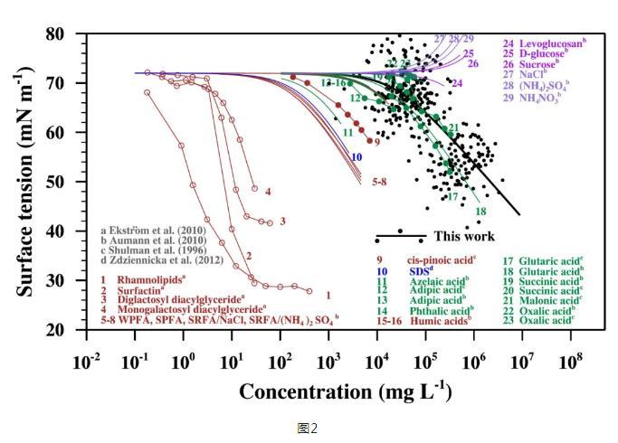 我們進一步比較了這次外場觀測中,城市氣溶膠所含有機物與各類已知化學成分的有機物造成的表面張力降低與有機物濃度的依賴關系,即Szyszkowski-Langmuir(S-L)曲線。結果表明,城市氣溶膠中隨表面活性有機物濃度增加導致表面張力降低的程度最接近二羧酸的依賴曲線。二羧酸在城市大氣氣溶膠中含量豐富,來源為人為源和生物源揮發性有機物的氧化降解,依此推測二羧酸在降低城市氣溶膠表面張力方面起著關鍵作用(圖2)。