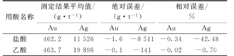 鉍氧化過程中,氧化鉍進入灰皿粉末吸收,粗鉍里面大部分金銀留在粉末上方,類似用灰皿灰吹。用硝酸溶解,固體物質很快就溶解了,但金銀合粒也被溶解了,所以不能用硝酸溶解。用硫酸溶解,固體物質和硫酸幾乎不反應,所以不能使用硫酸。用鹽酸和乙酸可以順利溶解固體物質,但鹽酸也溶解金、銀。實驗樣品金含量463.8 g/t,銀含量20 037 g/t,得到結果如表4所示,從表4可知使用乙酸溶解除鉍結果準確,所以選用乙酸作為溶解除鉍用酸。