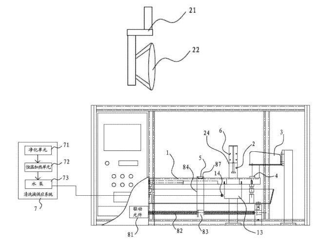 [0018]在一些實施方式中,還包括清洗液供應系統,清洗液供應系統包括凈化單元、恒溫加熱單元和泵體。清洗液通過凈化單元凈化并通過恒溫加熱單元進行加熱后,再經由泵體供應到清洗槽當中。其有益效果是,先通過凈化單元,可以預先清除掉清洗液當中可能存在的油。另外,通過恒溫加熱單元可以將清洗液加熱到一定的溫度。因為溫熱狀態的清洗液,可以實現更加的油脂清除能力,從而可以將樣品上的油更方便且更完全的清洗下來。