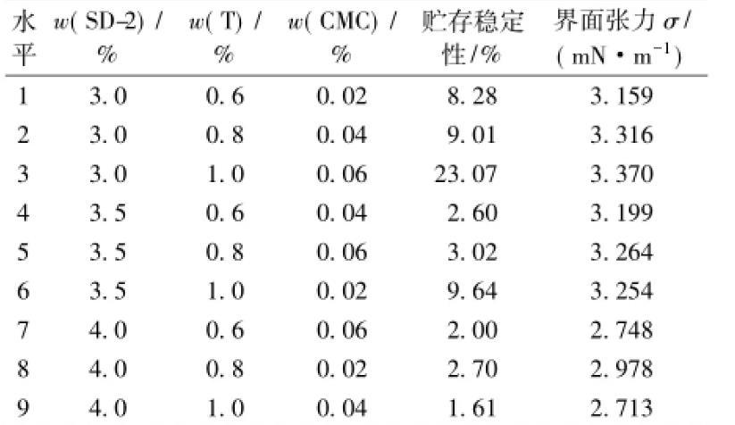 乳化劑SD-2,締合型增稠劑T和羧甲基纖維鈉等是CA砂漿陰離子乳化瀝青中最關(guān)鍵的3種組分,對(duì)乳化瀝青的性能起著決定性的影響。為了比較對(duì)油水界面張力和乳化瀝青貯存穩(wěn)定性的影響,采用L9(34)正交試驗(yàn)的方法進(jìn)行優(yōu)化設(shè)計(jì),因素水平見表1。