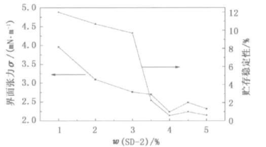 圖1乳化劑用量對(duì)界面張力和貯存穩(wěn)定性界面張力的影響