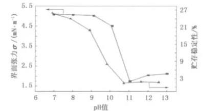 圖2皂液pH值對(duì)界面張力和貯存穩(wěn)定性界面張力的影響