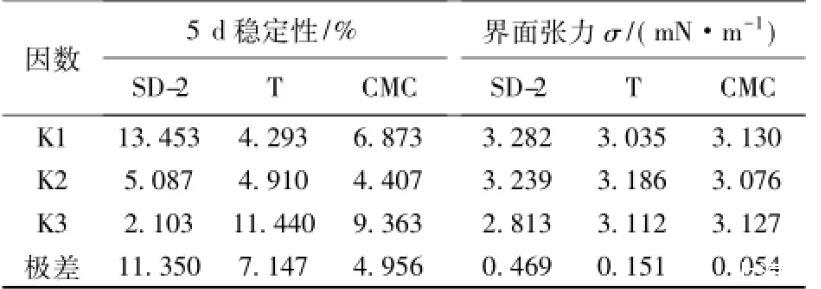 根據(jù)正交試驗(yàn)表,配制不同配合比的皂液,調(diào)節(jié)pH值為11,制備乳化瀝青測(cè)定其貯存穩(wěn)定性,并測(cè)定不同配合比的皂液與瀝青甲苯模擬油的界面張力,結(jié)果見表2。對(duì)試驗(yàn)結(jié)果進(jìn)行對(duì)比分析和極差分析,結(jié)果見表3。