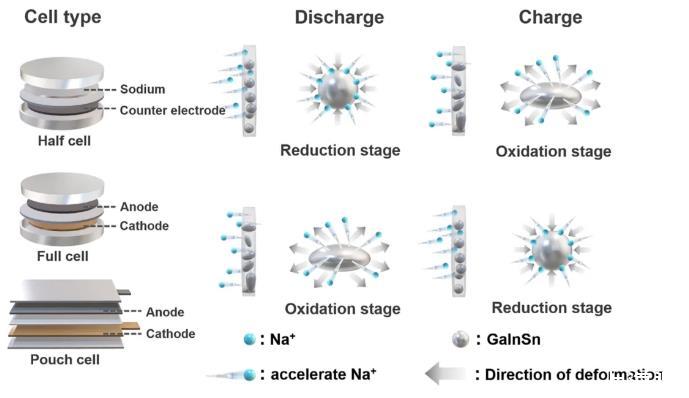 近日,大連理工大學胡方圓教授針對鈉離子電池中離子傳輸動力學緩慢問題,提出了微應力泵促進離子流傳輸的新策略,創制了電極電勢-應力自調節材料,促進了Na+快速傳輸,揭示了電極電勢與液態金屬界面張力之間的構效關系,闡明了微應力場促進Na+傳輸新機制。為了實時探究鈉離子電池充放電過程,將光纖布拉格光柵傳感器置入軟包電池中,并通過解耦傳感器信號原位探究其充放電機理,該工作從微應力場的角度為改善Na+傳輸動力學過程提供了可借鑒的新思路。該工作以《Micro-stress pump with variation of stress to boost the ion transport for high-performance sodium-ion batteries》為題發表在能源領域國際知名期刊Energy&Environmental Science上,大連理工大學博士生金鑫為本論文的第一作者,胡方圓教授為通訊作者。