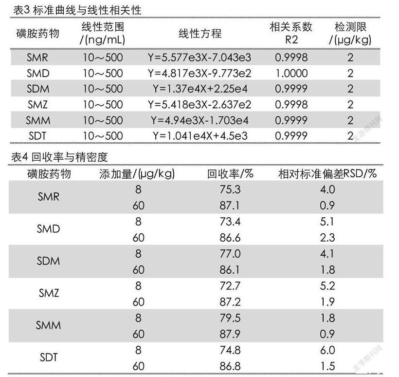 制備混合標準濃度系列,分別為10、50、100、250和500 ng/mL(分別相當于被測組分的含量為2、10、20、50和100μg/kg)。將標準工作液按照2.3.3的方法進樣測試。以進樣濃度為橫坐標,以峰面積的響應值為縱坐標繪制標準曲線,結(jié)果如表3所。6種磺胺類藥物在濃度10~500 ng/mL范圍內(nèi)線性關(guān)系很好,相關(guān)系數(shù)R2≥0.9998。