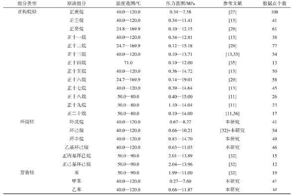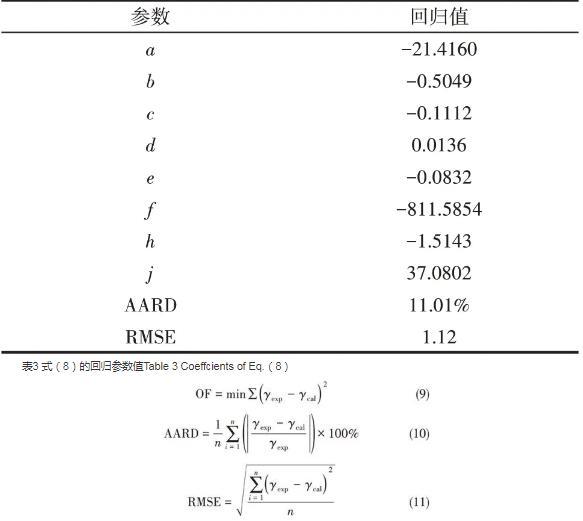 2.4.2實驗數據回歸及模型參數的求取本研究系統收集了文獻數據,并將研究測定的實驗數據,共計932個數據用于回歸,回歸所用數據見表2。回歸參數由最小二乘法得到,其目標函數如式(9)所示。采用平均相對偏差(AARD)和均方根誤差(RMSE)表示計算效果,如式(10)、式(11)所示。回歸結果見表3。