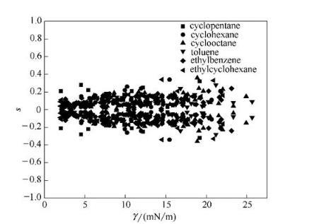 用于擬合的全部數據中,86.4%的數據的平均相對偏差在20%以內。界面張力小于5 mN/m時,偏差較大。式(8)對于CO2-正構烷烴/芳香烴/不帶支鏈的環烷烴/芳香烴體系的擬合結果較好,對于CO2-帶支鏈環烷烴體系擬合結果相對較差。