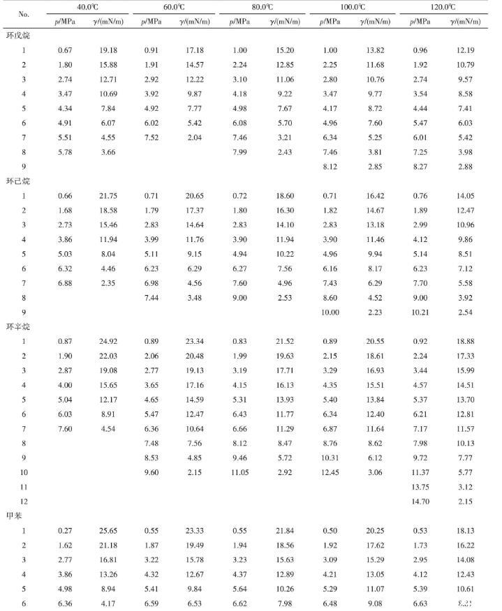 (5)對實驗所測以及文獻的數據進行了關聯,其平均相對偏差為11.01%。結果表明,此經驗方程可較好地用于CO2-正構烷烴/環烷烴/芳香烴體系界面張力的計算。且與狀態方程結合密度梯度理論相比,無需相平衡數據及影響因子參數,應用更為簡便。可為今后計算多元組分界面張力提供支持。