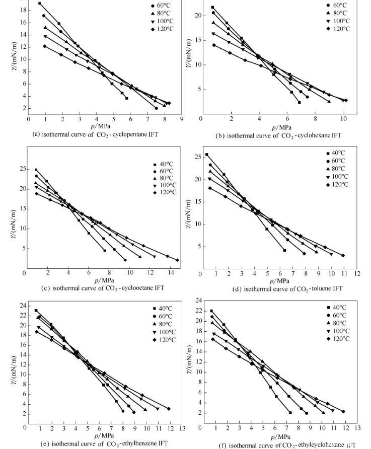 圖6 CO2-相似結構(環烷烴/芳香烴)界面張力的等溫線