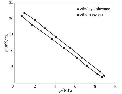 為探究相同碳原子數、不同結構的影響,選取60℃下CO2-乙基環己烷/乙苯體系進行比較。由圖7可以看出,兩種體系的界面張力下降趨勢基本相同,但CO2-乙苯的界面張力略高于CO2-乙基環己烷體系。姬澤敏等、Nagarajan等曾對CO2-苯/環己烷體系的界面張力進行過測定,發現兩種體系界面張力隨壓力變化的等溫線幾乎重合,而CO2-乙基環己烷/乙苯體系界面張力差異明顯。從分子層面考慮,這是由于乙苯的極性比乙基環己烷大,從而導致乙苯分子間的相互作用更強,處于界面層的乙苯分子更難擴散到CO2中去,使得CO2-乙苯體系的界面張力大于CO2-乙基環己烷體系。