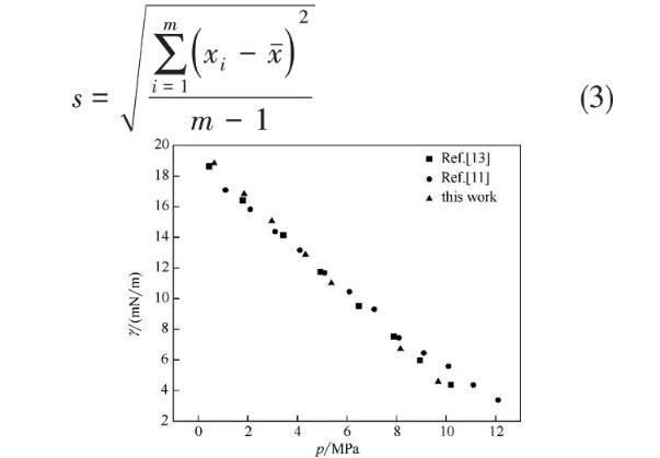 本研究測定了CO2-環戊烷/環己烷/環辛烷/甲苯/乙苯/乙基環己烷體系的界面張力,測量的溫度范圍為40~120℃,壓力范圍為0.27~14.70 MPa。實驗數據見表1。并繪出實驗數據的標準差圖,結果如圖3所示。結果表明,所有數據的標準差均在0.36 mN/m以內,證明數據的準確性較好。其中,標準差的計算如式(3)所示