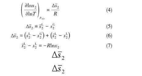 溫度對界面張力的影響比較復雜,首先溫度影響界面張力隨壓力的下降速度,隨著溫度的升高,界面張力下降速度越來越緩,使得不同等溫線在某個壓力范圍內有交叉點;其次,不同區域內,溫度對界面張力的影響不同。在交叉點以上,界面張力隨溫度的升高而減小,而交叉點之下,界面張力隨溫度的升高而增大。為了分析溫度對CO2溶解度的影響,將Gibbs-Helmholtz方程計算的溶解度對溫度的導數與偏摩爾熵聯系起來,如式(4)~式(7)所示