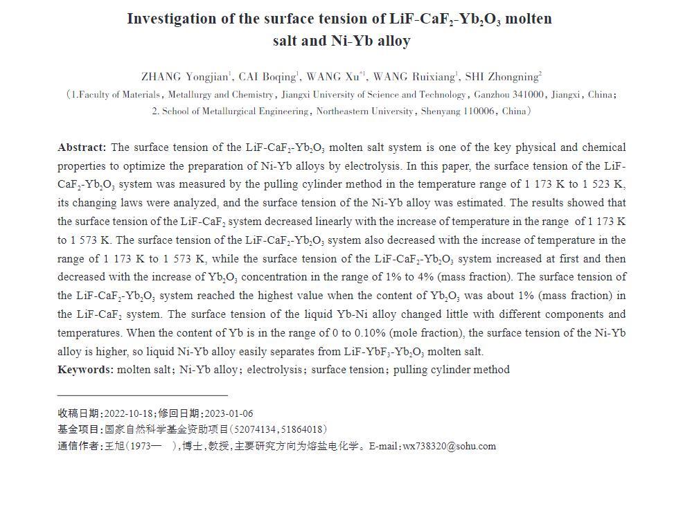 LiF-CaF2-Yb2O3熔鹽體系的表面張力是優(yōu)化電解制備Ni-Yb合金的關鍵物理化學性質之一。本文采用拉筒法測定在1173~1523 K溫度范圍內LiF-CaF2-Yb2O3體系的表面張力,并分析其變化規(guī)律,估算Ni-Yb合金的表面張力值。