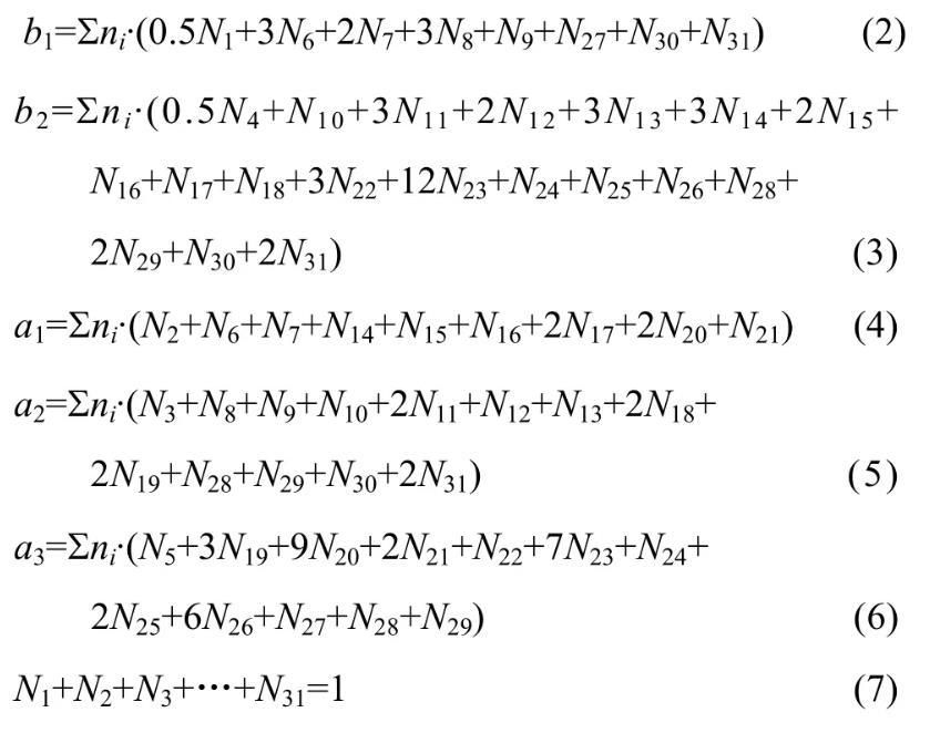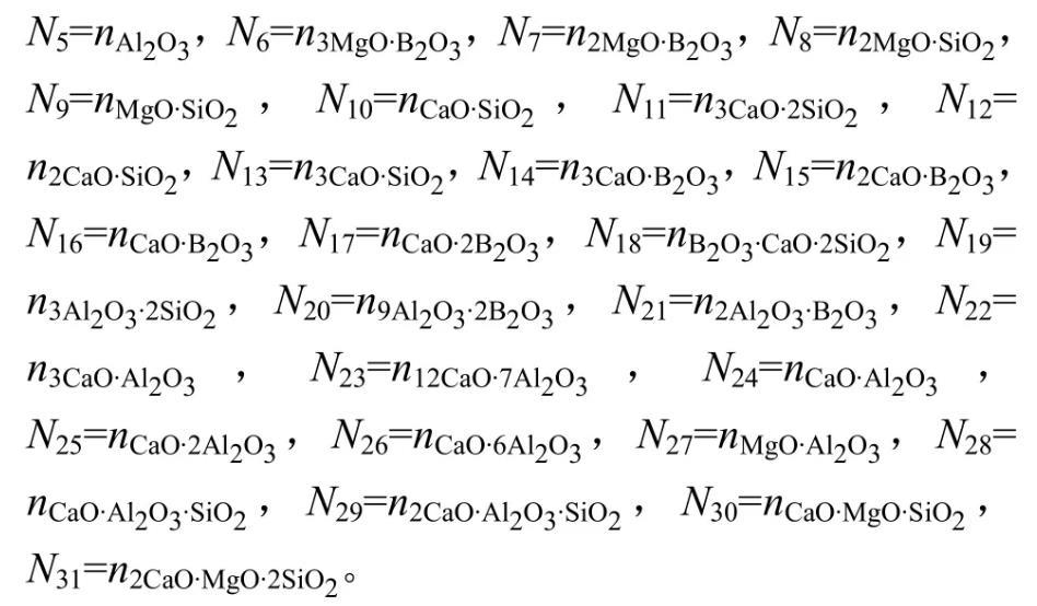 因此,由表1和式(2)~(7)建立計(jì)算MgO-B2O3-SiO2-CaO-Al2O3渣系中結(jié)構(gòu)組元和離子對(duì)作用濃度Ni的控制方程,其中N6~N31由N1~N5表示出來(lái)。在一定溫度下,熔渣成分代入該方程組,采用迭代法計(jì)算出所有結(jié)構(gòu)組元和離子對(duì)的作用濃度。