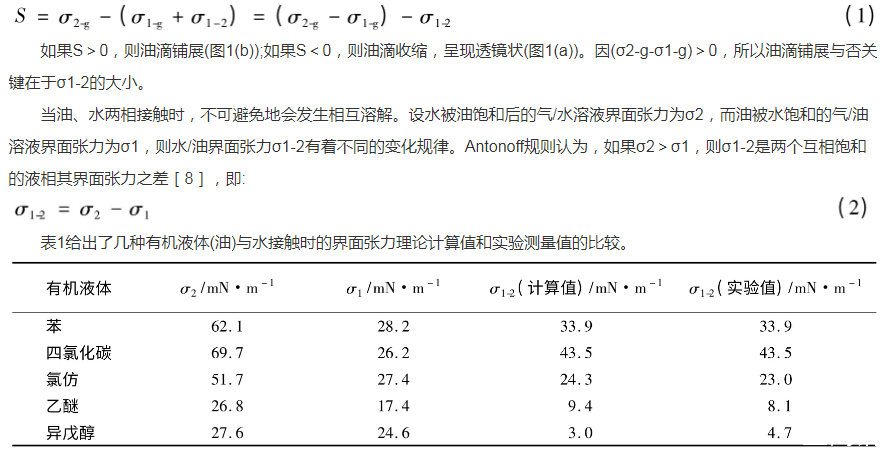 圖1中液體表面存在界面張力[5-6],其值的大小是物質(zhì)分子間相互作用的一種反映,與物質(zhì)的本性有關(guān)。在常見純液體中,水的界面張力最高,25℃時(shí)為72.0mN·m-1,極性有機(jī)物液體的界面張力大多低于50mN·m-1,非極性有機(jī)液體的界面張力一般更小[7]。由此可知,氣/水界面張力大于氣/油界面張力,即σ2-g>σ1-g。根據(jù)鋪展系數(shù)(S)的定義: