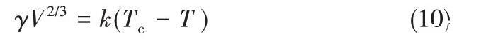 式中,γ是樣品在溫度T下測得的表面張力;V是液體的摩爾體積;Tc是臨界溫度;k是經驗常數。將實驗值γ和V2/3的乘積相對于熱力學溫度T進行線性回歸,并獲得一條直線,從直線和截距的斜率,可以得到k和Tc的值。對于大部分有機液體來說,k大約為2.1×10-7J·K-1,而對于簡單熔鹽,k比較小,NaCl的k≈10-7J·K-1。