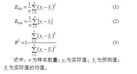 按照8∶2的比例將實驗數據劃分為訓練集和測試集,對每個模型進行訓練,并在測試集上進行驗證。這里選用3種常用于回歸任務的評價指標:均方誤差(MSE)、平均絕對誤差(MAE)和決定系數(2)。MSE和MAE可以衡量預測值與真實值之間的誤差,數值越小表示模型預測的越準確;2度量模型擬合數據的程度,取值范圍在0到1之間,越接近1表示模型對數據的擬合程度越好。這3個評價指標的計算公式如下所示: