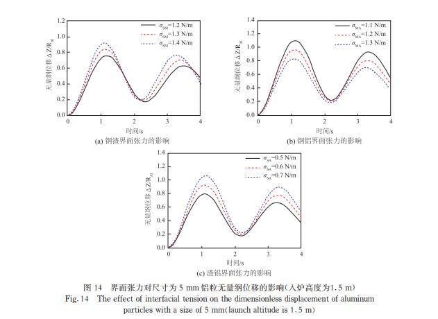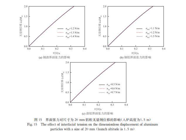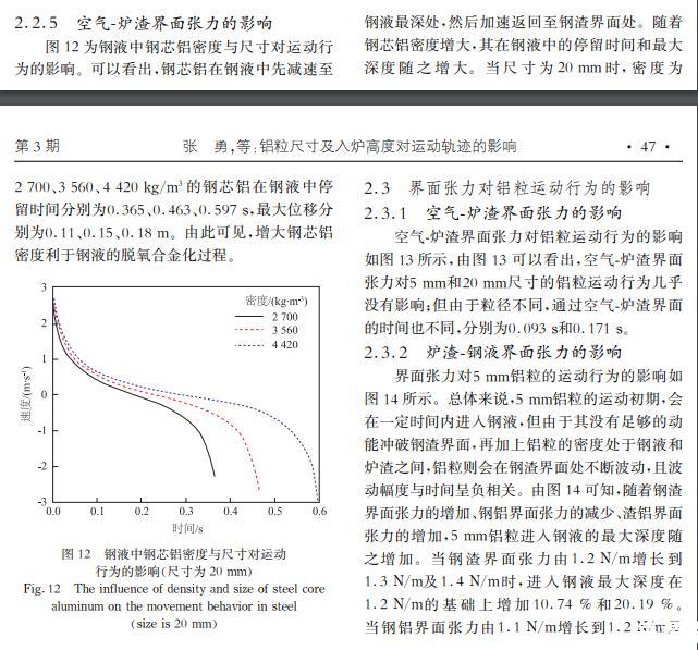 增加鋼渣界面張力、減小鋼鋁界面張力或增加渣鋁界面張力有利于鋁粒進(jìn)入鋼液,而鋁粒的尺寸大于20 mm,界面張力對鋁塊運(yùn)動(dòng)幾乎沒有影響;增大密度會(huì)使鋼芯鋁在鋼液中停留更長時(shí)間,有利于鋼液脫氧。