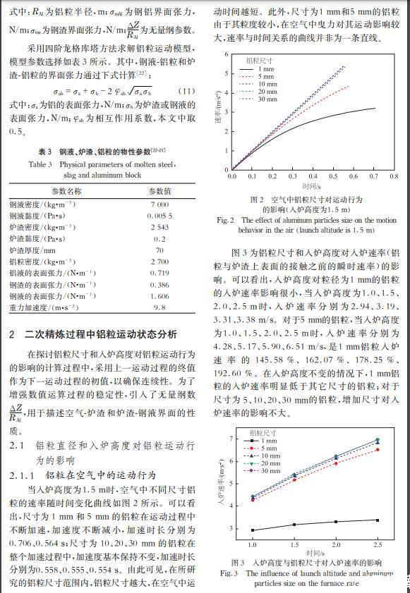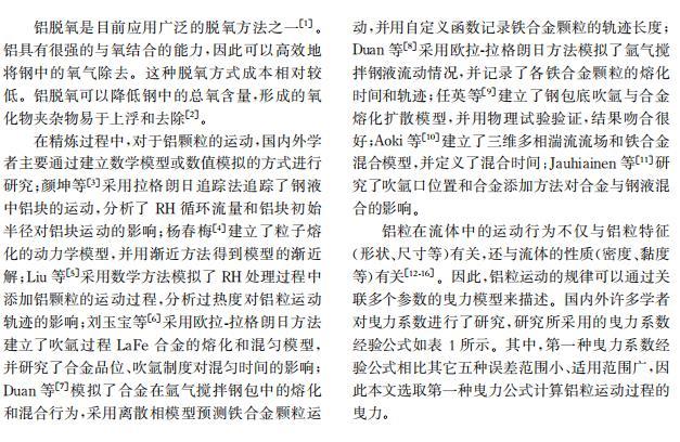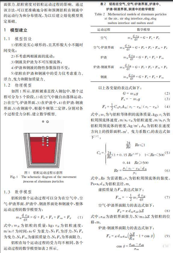 摘要: 二次精煉過程中,鋁是鋼液進(jìn)行脫氧及合金化的主要物料之一,但純鋁的密度小于鋼液,能否穿越渣層與鋼液接觸及接觸時(shí)間對鋁的脫氧效果和鋼中溶解鋁的含量有直接影響。在忽略鋁的熔化、溶解及化學(xué)反應(yīng)的情況下,通過對鋁粒運(yùn)動(dòng)過程受力分析,建立鋁粒在氣-渣-鋼相內(nèi)的三維運(yùn)動(dòng)數(shù)學(xué)模型,明晰鋁粒尺寸及入爐高度對鋁粒運(yùn)動(dòng)軌跡的影響。