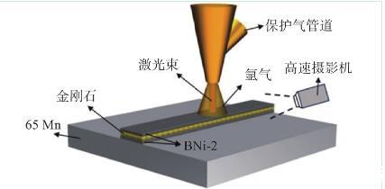 前期開展了激光釬涂金剛石技術研究,分析了激光功率和掃描速率對涂層微觀組織與力學性能的影響。從現有研究來看,已有的激光釬涂金剛石研究大多數集中于金剛石/釬料合金界面的組織演變和單層金剛石工具的機械加工性能方面,在釬涂層的成形過程方面尚未進行深入的研究工作。前期研究發現,在激光釬涂金剛石過程中,金剛石易于向表面聚集,這對涂層的整體性能提升將會產生極大的影響,因此需要針對涂層的成形行為及其機理方面進行深入的研究,進一步提升涂層的耐磨性能。文中采用BNi-2合金作為釬料,利用光纖激光在65Mn鋼基體上制備金剛石涂層,并利用高速攝影技術觀察金剛石激光釬涂過程中,鎳基粉末形成涂層和金剛石遷移全過程,分析釬涂層的成形行為及其機理,并討論激光釬涂金剛石的能量轉換與傳遞路徑,以期為激光釬涂金剛石的工程應用提供數據支撐。