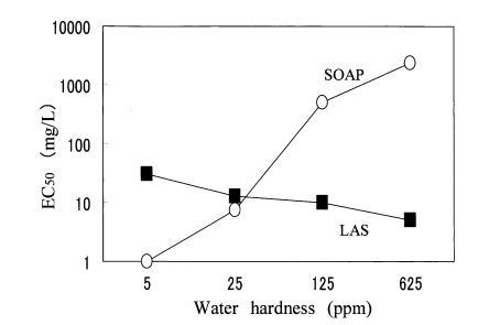 在預(yù)測(cè)試中,大型水蚤在 4 鹽混合中存活 溶液,但不能在 CaCl2?H2O 溶液中存活,也不能 蒸餾水。 另一方面,羅漢松在所有 3 種水中都能存活。 因此,羅漢果被用來 檢查水硬度成分對(duì) LAS 和 SOAP 的毒性。 如圖 3 所示,CaCl2?H2O 之間沒有觀察到毒性值的差異 溶液和四鹽混合溶液。 肥皂的毒性 隨著水硬度的增加而降低,和 LAS的毒性隨著水硬度的增加而增加。