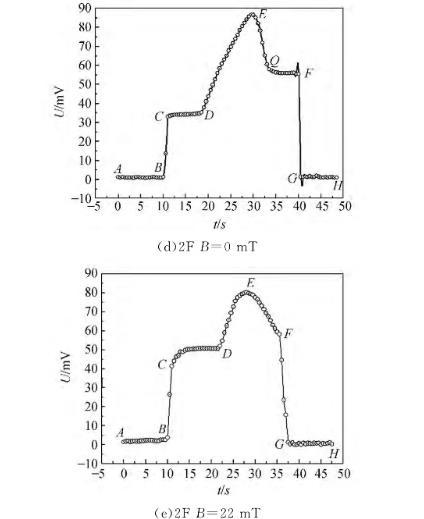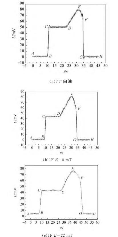 使用拉脫法測量了磁性液體的磁表面張力,無外加磁場作用時,磁性液體的表面張力小于其載液的表面張力,磁性液體液膜拉得更長,液膜收縮的趨勢比白油更明顯,這主要是因為磁性液體中加入的表面活性劑降低了其表面張力。由液膜拉脫過程電壓變化曲線可觀察到:不同條件下磁性液體的電壓變化情況不同,無外加磁場作用時2F號磁性液體在EF階段存在轉折點Q,越過轉折點,QF階段電壓變化較平緩,且表面張力越??;而7#白油和1F磁性液體并未出現此現象,這主要是因為7#白油和1F磁性液體表面張力較大,2F號磁性液體由于表面張力較小,其液體分子與分子之間的作用力較弱,宏觀表現為拉脫的液膜更長,液膜在空氣中會存在一段時間。有外加磁場作用時,2F號磁性液體在FG階段并未出現電壓變化平緩的中間過程,但FG階段出現了另一些數據點,液膜破裂的時間大于無外加磁場作用時的時間,主要是由于外加磁場增強了磁性顆粒之間的相互作用,分子和分子之間的磁吸引力增強,導致液膜逐步破裂。