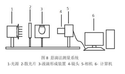 懸滴法的原理是利用液滴靜止懸掛在毛細管的管口處時,液滴的外形主要取決于重力和表面張力的平衡。通過測定懸掛著的液滴的外形參數,可推算出液體表面張力。懸滴法的測量試驗系統主要由光源、散光片、液滴形成裝置、鏡頭、相機、計算機等組成。測試步驟也很簡單,不需要清洗儀器,制樣完成后,接通電源,調節控溫器使溫度達到預設溫度點。將裝好試樣的石英比色皿和注射器置于恒溫室中,針頭必須保持垂直。一般液體恒溫時間為 30 min。控制注射泵進樣成滴,當液滴接近最大直徑時,按動快門,記錄液滴圖像,將攝影膠片印制成圖像。該檢測方法表面張力測定精度也是±0.1% 。此外要注意管尖的口徑不能過大以致生成大懸滴,溫度波動會產生對流和振動,使懸滴不穩定。