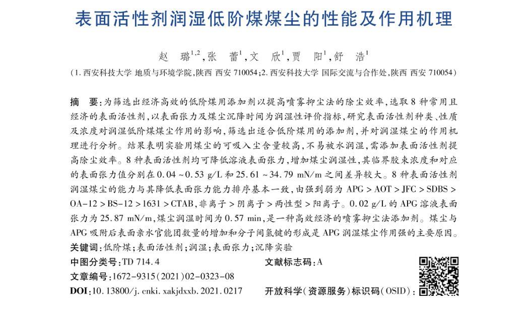 低階煤在中國儲量豐富且富含高附加值油氣資源,可以高效分質(zhì)利用,為緩解我國石油資源緊張和環(huán)境污染局面提供了新的可能,逐漸成為新的關注點。近年來隨著低階煤開采量的增大,采煤機械化程度的提高,全機械化工作面上的煤塵濃度可達3 000 mg/m3,遠超國家職業(yè)衛(wèi)生標準中的要求。長時間暴露于超標的煤塵環(huán)境是礦工患塵肺病的重要誘因之一。塵肺病發(fā)病率高且無法治愈,2018年,全國報告的職業(yè)性塵肺病19 468例,占到了各類職業(yè)病新病例總數(shù)的8285%,且發(fā)生率還有上升趨勢。此外,井下煤塵濃度聚集到一定程度還會引發(fā)爆炸,造成更大的人員傷亡和經(jīng)濟損失。因此,有效抑制礦塵對煤礦安全生產(chǎn)和礦工的職業(yè)健康安全都至關重要。目前常用的措施包括通風除塵、煤層注水、噴霧灑水等,這些技術對降低作業(yè)點的粉塵濃度都起到了重要作用。低階煤的煤化程度較低、揮發(fā)分及灰分含量高、含水率高、含氧多、孔結構豐富,與其他煤種相比通常更易被潤濕,因此適用噴霧抑塵。噴灑自來水的除塵效率只有不到60%,向水中加入表面活性劑可以增加煤塵潤濕性和滲透性,提高除塵效率。化學表面活性劑的選擇受自身性質(zhì)、結構、煤塵表面官能團、煤塵帶電性質(zhì)等多種因素的影響,其選擇具有特異性和專一性,目前關于抑制低階煤煤塵添加劑的研究還較少。篩選出常用且經(jīng)濟的表面活性劑作為添加劑提高低階煤煤塵的除塵效率具有積極意義。