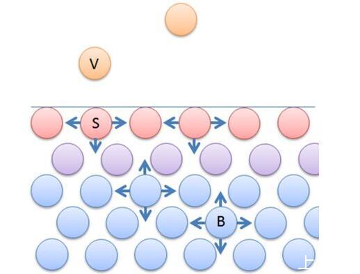 在水中,如B所示,內(nèi)部水分子所受鄰近相同分子的作用力是對稱的,各方向的力相互抵消。但物質(zhì)表面層分子與內(nèi)部分子周圍的狀況不同,水最外層分子會受到整個水滴內(nèi)部分子的斥力,而抵消這個斥力的便是水的表面張力。