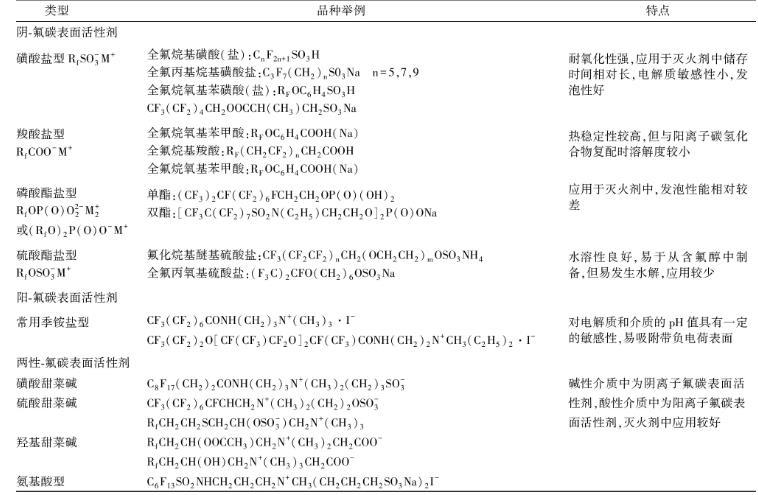 通過將短鏈氟碳表面活性劑進(jìn)行優(yōu)選和整理,可以清晰地看出,目前有四種類型:①短鏈陰-氟碳表面活性劑常以磺酸鹽和羧酸鹽為合成原料,這是由于兩者本身就具有良好的穩(wěn)定性和親水性,引入氟原子后可以使其發(fā)揮出更大的性能優(yōu)勢;②短鏈陽-氟碳型化合物的制備原料多為全氟季銨鹽類,它可以不受pH值影響,且與其他碳?xì)浠衔锏膹?fù)配協(xié)同性較好,非常具有工業(yè)應(yīng)用的價(jià)值;③短鏈兩性-氟碳型化合物中,甜菜堿類型比常規(guī)碳?xì)浠衔锏幕钚愿撸瑫r(shí)它的寬等電點(diǎn)也在一定程度上增加了它的pH適用范圍,且應(yīng)用成本不高,生物降解性好,所以同樣具有很大商業(yè)開發(fā)價(jià)值;④短鏈非離子-氟碳表面活性劑在水溶液中為非離子狀態(tài),故穩(wěn)定性高,不受pH值影響,可適應(yīng)強(qiáng)酸堿性的環(huán)境,并且與碳?xì)浠衔飶?fù)配后的協(xié)調(diào)性良好。但當(dāng)前所報(bào)道的非-氟碳表面活性劑多為長鏈結(jié)構(gòu),不利于環(huán)境的可持續(xù)發(fā)展,建議應(yīng)加快短鏈結(jié)構(gòu)研發(fā)和應(yīng)用的研究步伐。各種離子類型氟碳表面活性劑及其特性見表1。