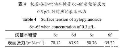 表3所示為烷基-β-D-吡喃木糖苷6c~6f的臨界質(zhì)量分?jǐn)?shù)及所對應(yīng)的表面張力。溶液表面的吸附量達(dá)到飽和時(shí)(剛好飽和時(shí)的濃度即為臨界濃度),表面張力最小。從表3可以看出:辛基-β-D-吡喃木糖苷(6e)達(dá)到臨界濃度時(shí)對應(yīng)的表面張力是最低的,能力最強(qiáng)。因?yàn)橥榛咎擒盏谋砻婊钚允怯善溆H水糖基和疏水烷基鏈共同決定,當(dāng)烷基鏈長為=8(糖苷6e)時(shí),親水性和疏水性達(dá)到最佳平衡,表面張力最低。