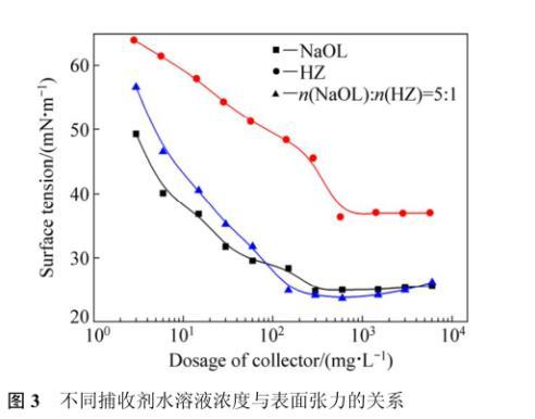 表面張力是影響浮選過程中氣泡的穩(wěn)定性,以及氣泡形成難易程度的主要參考數(shù)據(jù),臨界膠團(tuán)濃度(簡(jiǎn)稱CMC)是反映表面活性劑降低水溶液表面張力的效率。組合用藥的浮選效果優(yōu)于單一用藥,這可能與其在水溶液中的表面張力有一定的關(guān)系。圖3所示為最佳pH條件下(pH=9.0)組合捕收劑與兩種單一捕收劑的水溶液濃度與表面張力的關(guān)系。NaOL在水中微量的添加顯著地降低了水的表面張力,而隨著NaOL濃度的增加,溶液的表面張力逐漸下降,在濃度為302 mg/L時(shí)溶液的表面張力達(dá)到最低,為22.7~24.8 mN/m。此后NaOL濃度的增加并不能顯著地降低水的表面張力,所以可以確定NaOL的CMC值約為302 mg/L,與文獻(xiàn)中報(bào)道的1.03×10?3mol/L(308 mg/L)接近。而HZ的CMC值568 mg/L,表面張力36.37 mN/L。作為一種表面活性劑,其表面活性明顯不如NaOL,在較高濃度下,HZ才能形成膠團(tuán)。浮選HZ用量為200 mg/L,低于其CMC值,在此濃度下,膠團(tuán)未形成,表面張力較高,起泡性不佳,在單礦物浮選試驗(yàn)中表現(xiàn)出了泡沫量小的特點(diǎn)。組合捕收劑水溶液的表面張力測(cè)試結(jié)果表明,CMC值約為150 mg/L,CMC值下水溶液表面張力為24.88 mN/m??梢奌Z的添加能降低NaOL的CMC值,這可能是NaOL作為一種陰離子型表面活性劑,親水“離子頭”之間的靜電作用較強(qiáng),非離子表面活性劑的“插入”到親水“離子頭”之間,同時(shí)亞氨基也存在一定程度的解離,使得離子之間的靜電斥力減小。