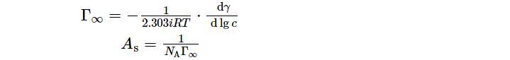 為了更全面地研究表面活性劑溶液性質,采用Gibbs吸附公式建立了表面吸附量和表面張力及活度之間的關系,根據表面活性劑表面張力變化曲線,可利用其得出表面飽和吸附量(Γ∞),由于表面活性劑溶液濃度很小,趨近于稀溶液,其活度可約等于濃度。再通過與阿伏伽德羅常數的數量關系,計算每個吸附分子在溶液表面所占的平均面積(AS)。因此可由如下公式計算: