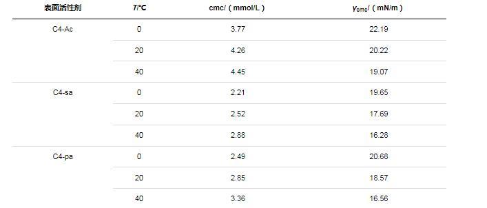 總體而言,溫度對甜菜堿氟碳表面活性劑的cmc影響較小。此外,在0~40℃的溫度范圍內,對比三種表面活性劑的表面活性參數可知,cmc值均小于4.45 mmol/L,γcmc均小于22.19 mN/m。親水端官能團的不同對表面活性劑的性能具有一定的影響,當溶液濃度足夠大時,C4-Ac的表面張力相對較高,C4-sa和C4-pa具有較低的表面張力,后者略高于前者,并且C4-sa和C4-pa的cmc值低于C4-Ac。因為從分子結構上來看,C4-Ac比C4-sa和C4-pa少一個有效碳,因此前者的疏水性要略弱于后二者,可以解釋表面張力和cmc的相對大小。