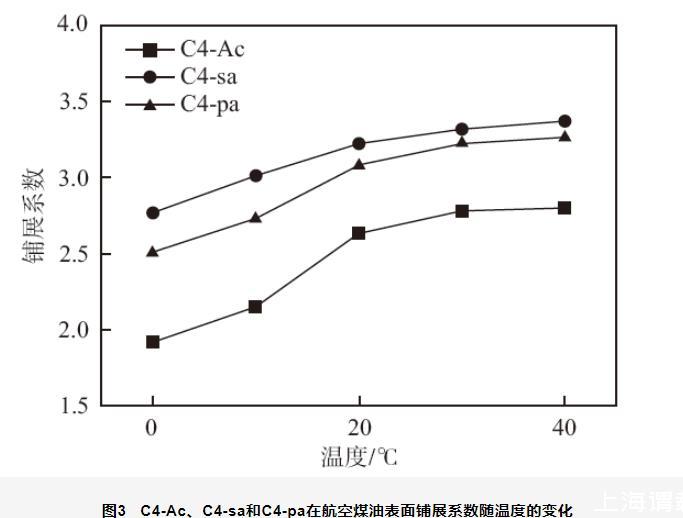 圖3 C4-Ac、C4-sa和C4-pa在航空煤油表面鋪展系數隨溫度的變化